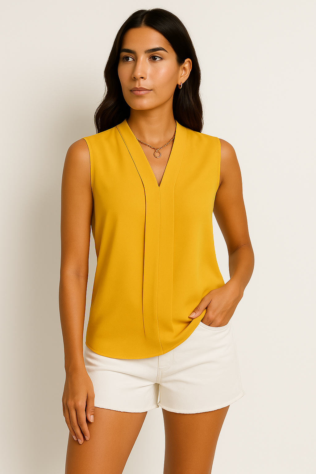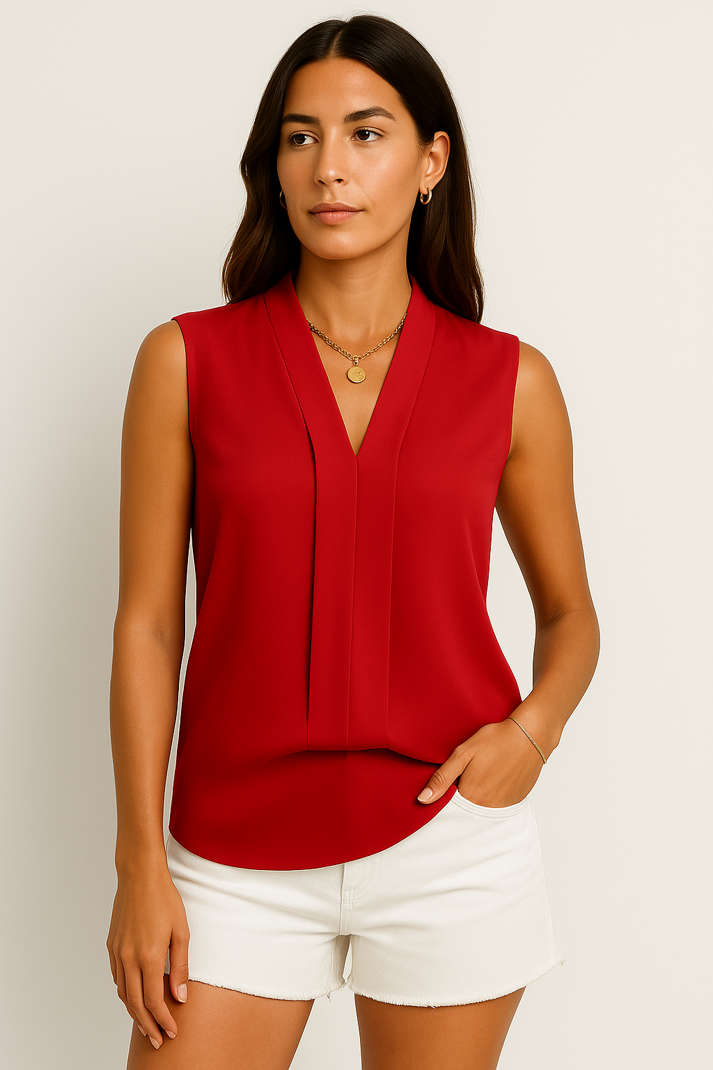 Erleben Sie stilvolle Eleganz mit dieser ärmellosen V-Ausschnitt Bluse, die durch ihren fließenden, lockeren Schnitt und den tiefen V-Ausschnitt besticht. Hergestellt aus weichem, atmungsaktivem Material, bietet sie an warmen Tagen optimalen Komfort und verleiht jedem Outfit eine feminine Note, ideal für den Alltag oder besondere Anlässe.