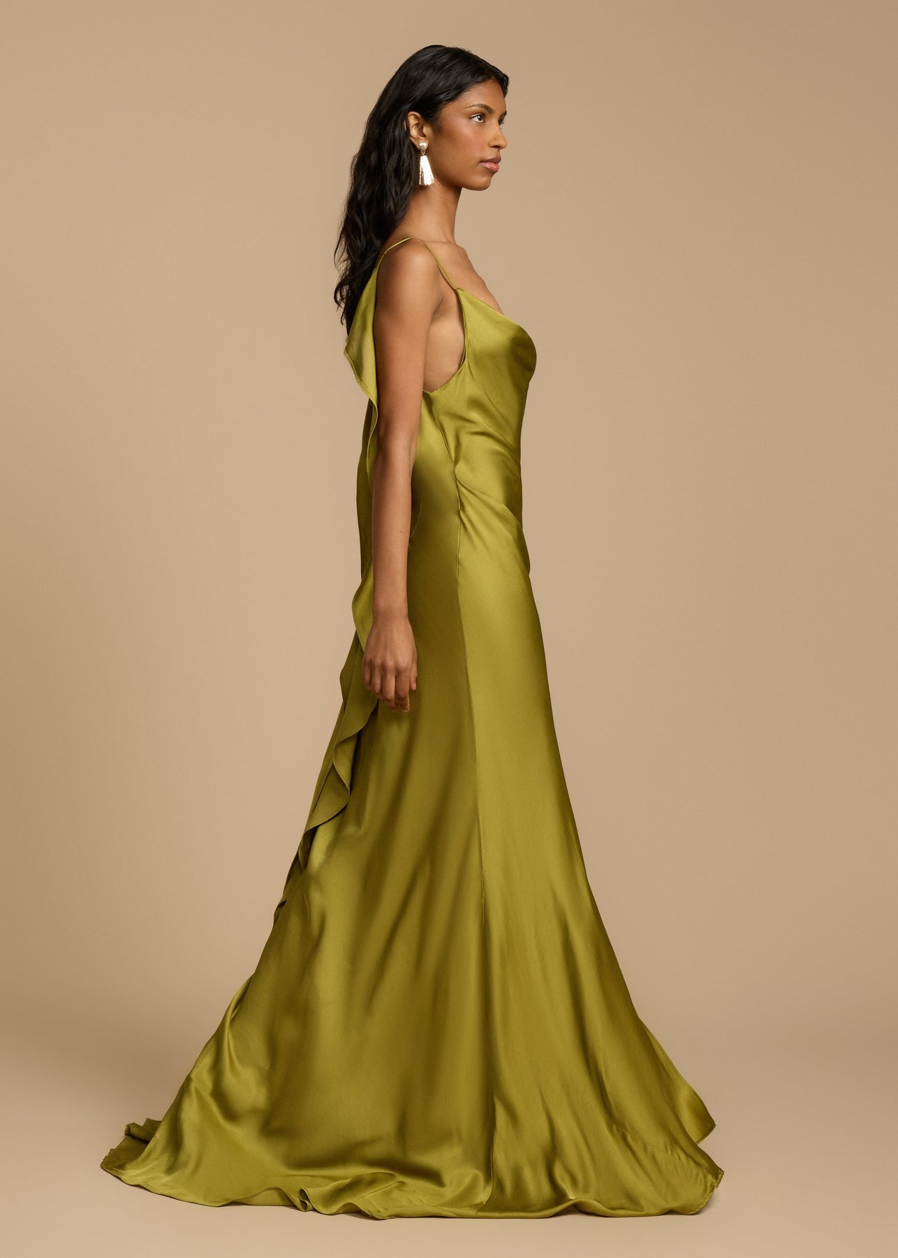 Dezente Falten an der Hüfte sorgen für Struktur und Harmonie, während schmale Träger und ein drapierter Ausschnitt ein perfektes Gleichgewicht mit einem gewagten, oberschenkelhohen Schlitz schaffen. Der asymmetrische V-Ausschnitt und die zarten Satinverzierungen sorgen für einen raffinierten und kunstvollen Abschluss.