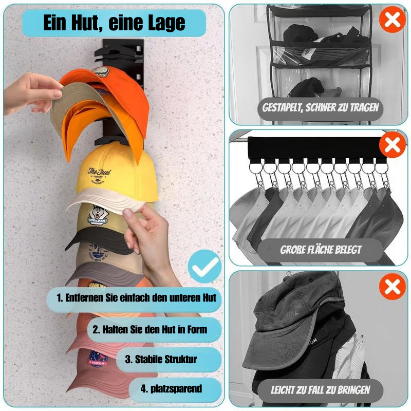 ✅Maximiert den Stauraum: Bewahren Sie Ihre Mützen ordentlich auf und sparen Sie wertvollen Platz im Schrank oder an der Wand. Das schlanke Gestaltung ermöglicht es Ihnen, mehrere Hüte in einer kompakten, vertikalen Anordnung aufzubewahren. Perfekt für kleine Räume oder große Sammlungen.