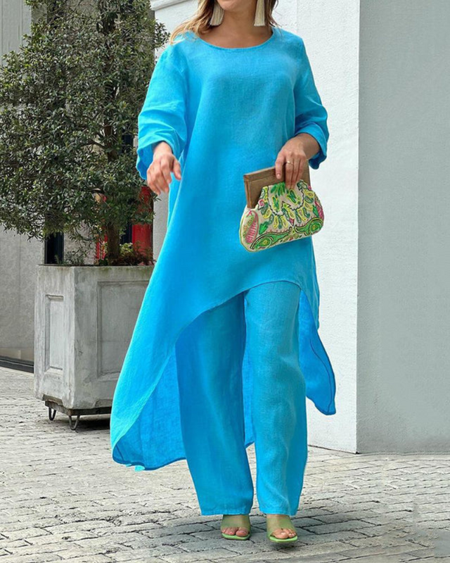 Dieses modische Freizeitset besteht aus einem luftigen Top und einer High-Waist-Hose, die ideal für warme Tage sind. Das Top überzeugt durch seinen lockeren Schnitt, der die Taille betont und eine schmeichelhafte Silhouette schafft. Die Hose bietet eine bequeme Passform und ist perfekt für verschiedene Anlässe, sei es am Strand oder in der Stadt.