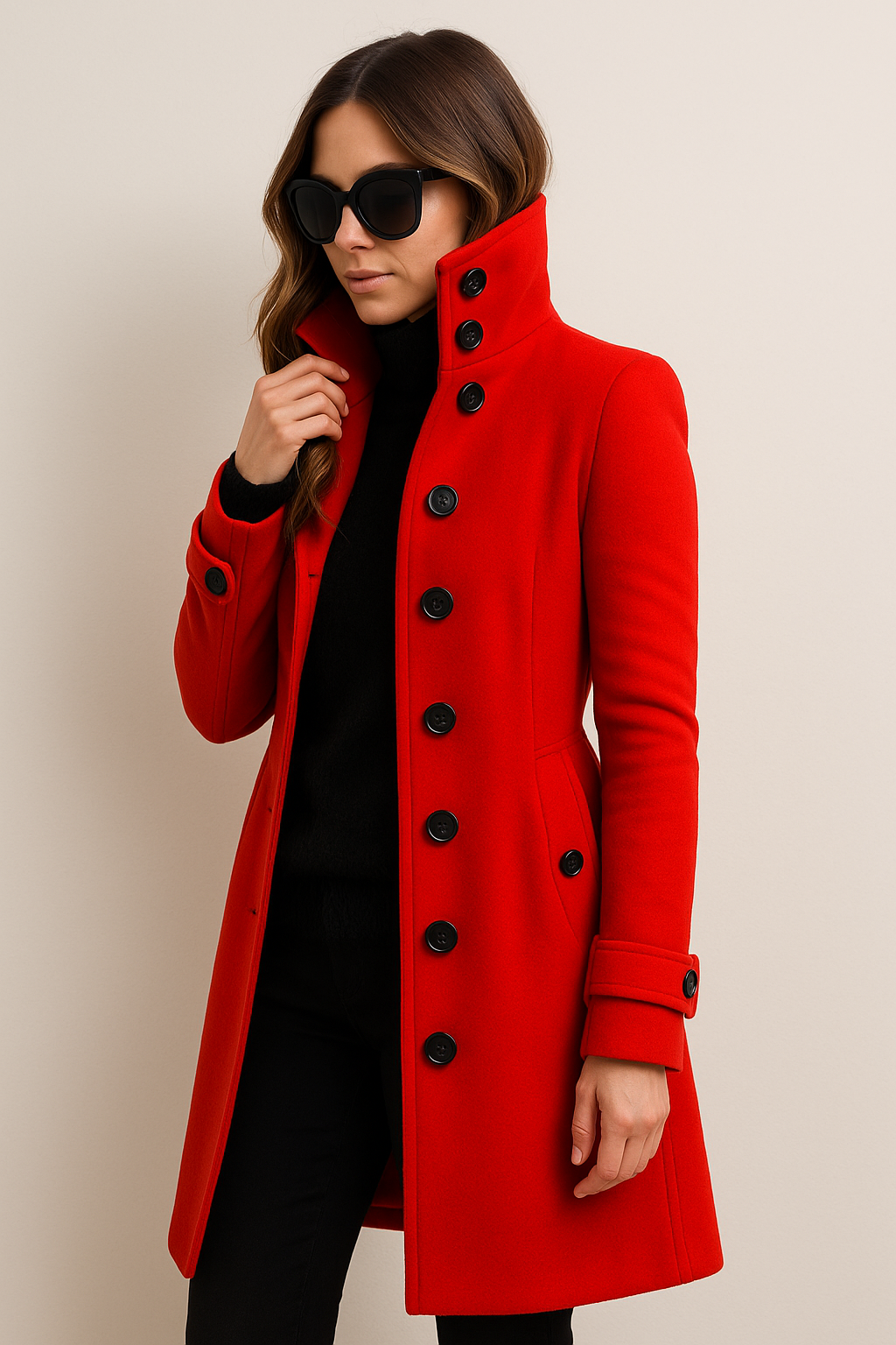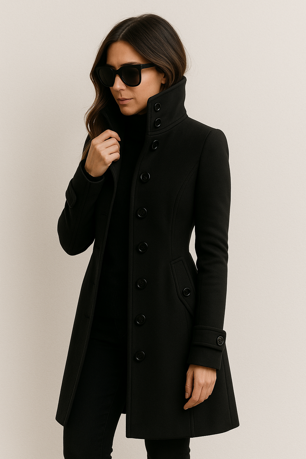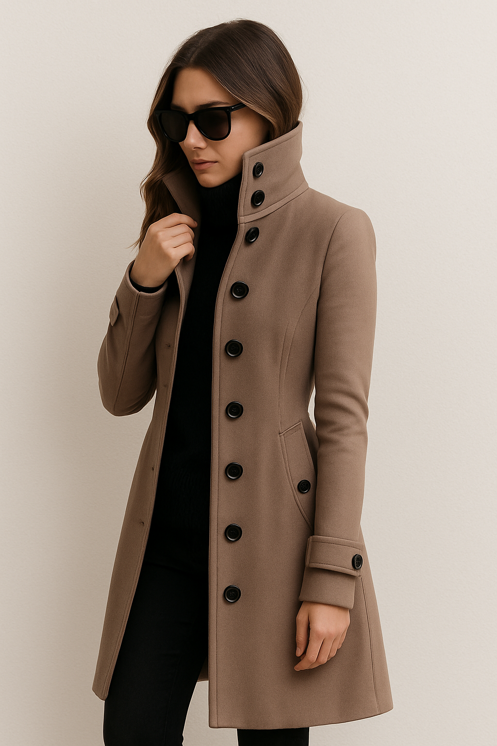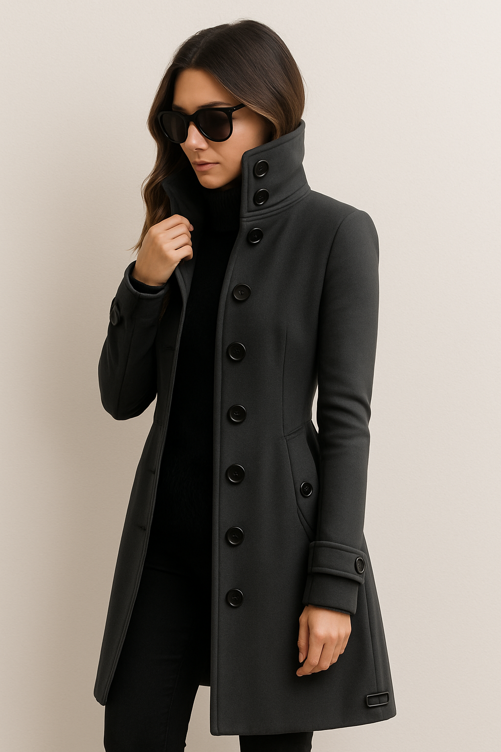 Mit seiner taillierten Silhouette, der stilvollen Knopfleiste und dem markanten Stehkragen bietet er sowohl Wärme als auch einen Hauch von urbaner Raffinesse. Die Verarbeitung und die Details machen diesen Mantel zum perfekten Begleiter für das Büro, die Freizeit oder festliche Anlässe. Er lässt sich über ein Kleid, einen Pullover oder ein Business-Outfit tragen und macht immer einen stilvollen Auftritt.