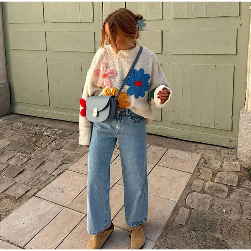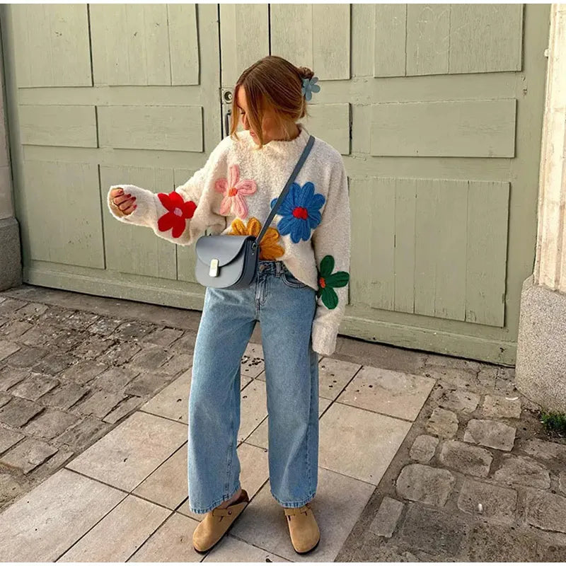 Farah - Grobstrickpullover mit auffälligen Blumen-Applikationen