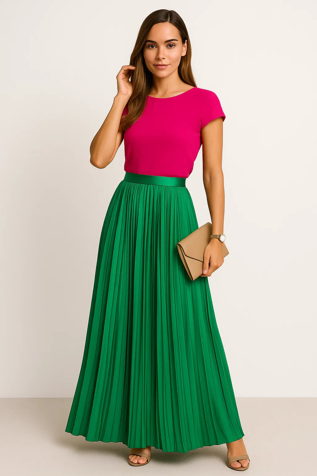 Dieser lange Faltenrock ist der Inbegriff von stilvoller Leichtigkeit für Frühling und Sommer. Mit seinem fließenden Schnitt und der angenehm luftigen Struktur ist er perfekt geeignet für warme Tage, an denen Komfort und Stil gleichermaßen zählen. Die schmeichelnde Länge verleiht jedem Schritt elegante Bewegung, während das vielseitige Design unzählige Stylingmöglichkeiten eröffnet. Ob in der Stadt, am Strand oder beim entspannten Cafébesuch, dieser Rock passt sich mühelos deinem Alltag an.