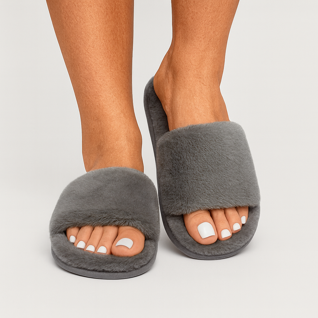 Diese flauschigen Slides kombinieren weiche Materialien mit einem offenen Zehendesign. Der breite Riemen sorgt für eine bequeme Passform, während die leichte Plattform Halt und entspannten Komfort im Alltag bietet.