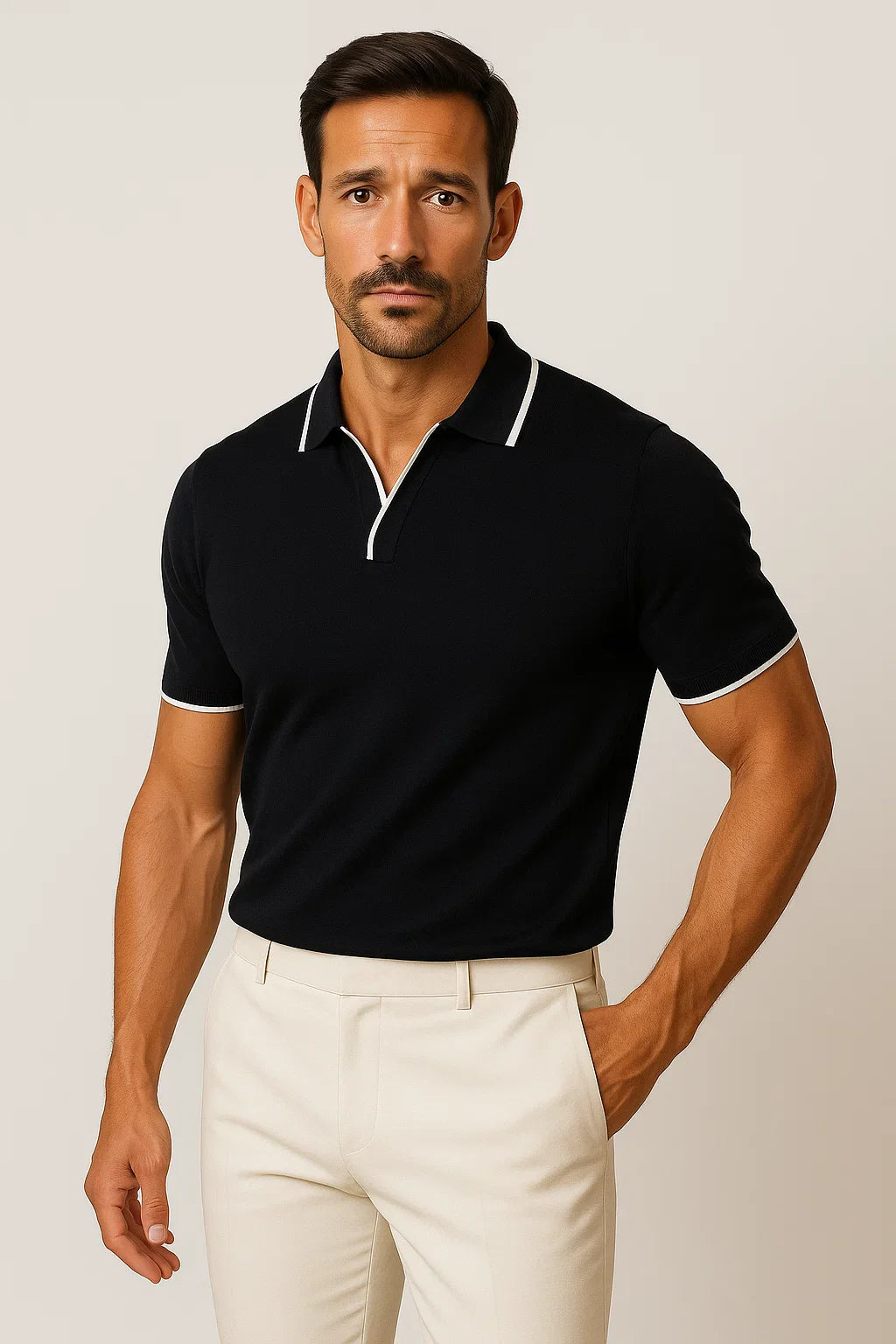 Dieses Polo-Shirt kombiniert zeitlose Eleganz mit einem modernen Twist. Der klassische Polokragen und die Kontrastabschlüsse an den Ärmelbündchen verleihen ihm eine edle Note, während das weiche Material für außergewöhnlichen Komfort sorgt. Der figurbetonte Schnitt macht dieses Polo zum idealen Begleiter für Business Casual Outfits oder gehobene Freizeit Looks. Setze auf Raffinesse und verleihe deinem Look eine gepflegte, elegante Ausstrahlung, immer und überall.
